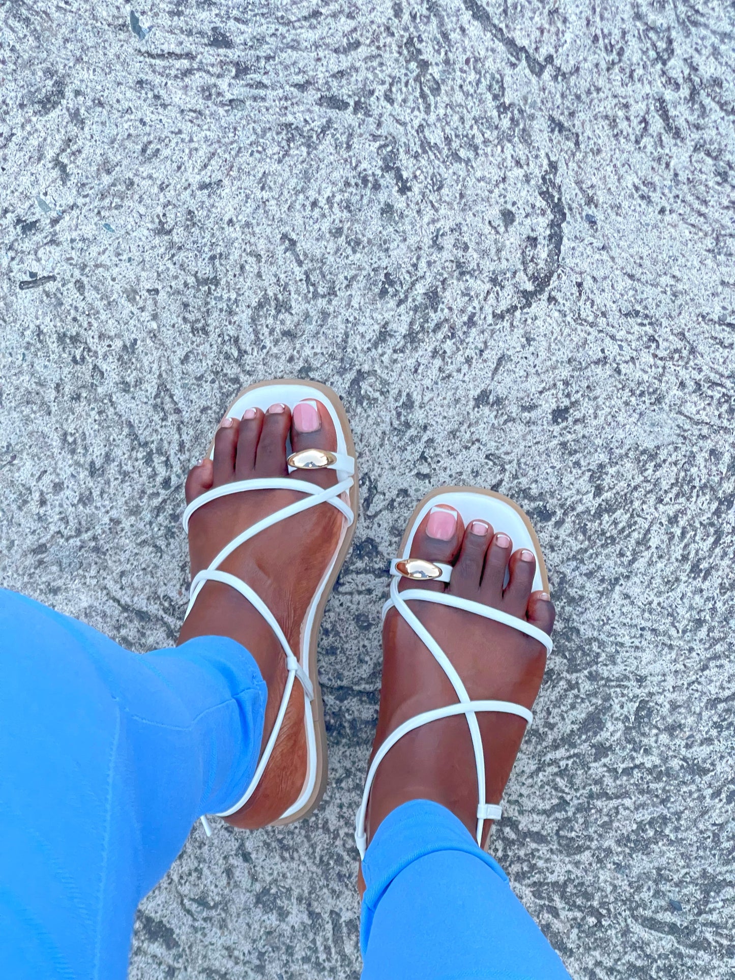 Elevate your effortless style with The Capri Strap Sandal — a delicate, minimalist design that speaks volumes. Featuring slender white straps, a toe ring with gold hardware accent, and a neutral cushioned insole, this flat sandal brings island-girl sophistication to everyday looks. Lightweight with a secure ankle buckle, it’s perfect for brunches, beach strolls, and breezy city walks.