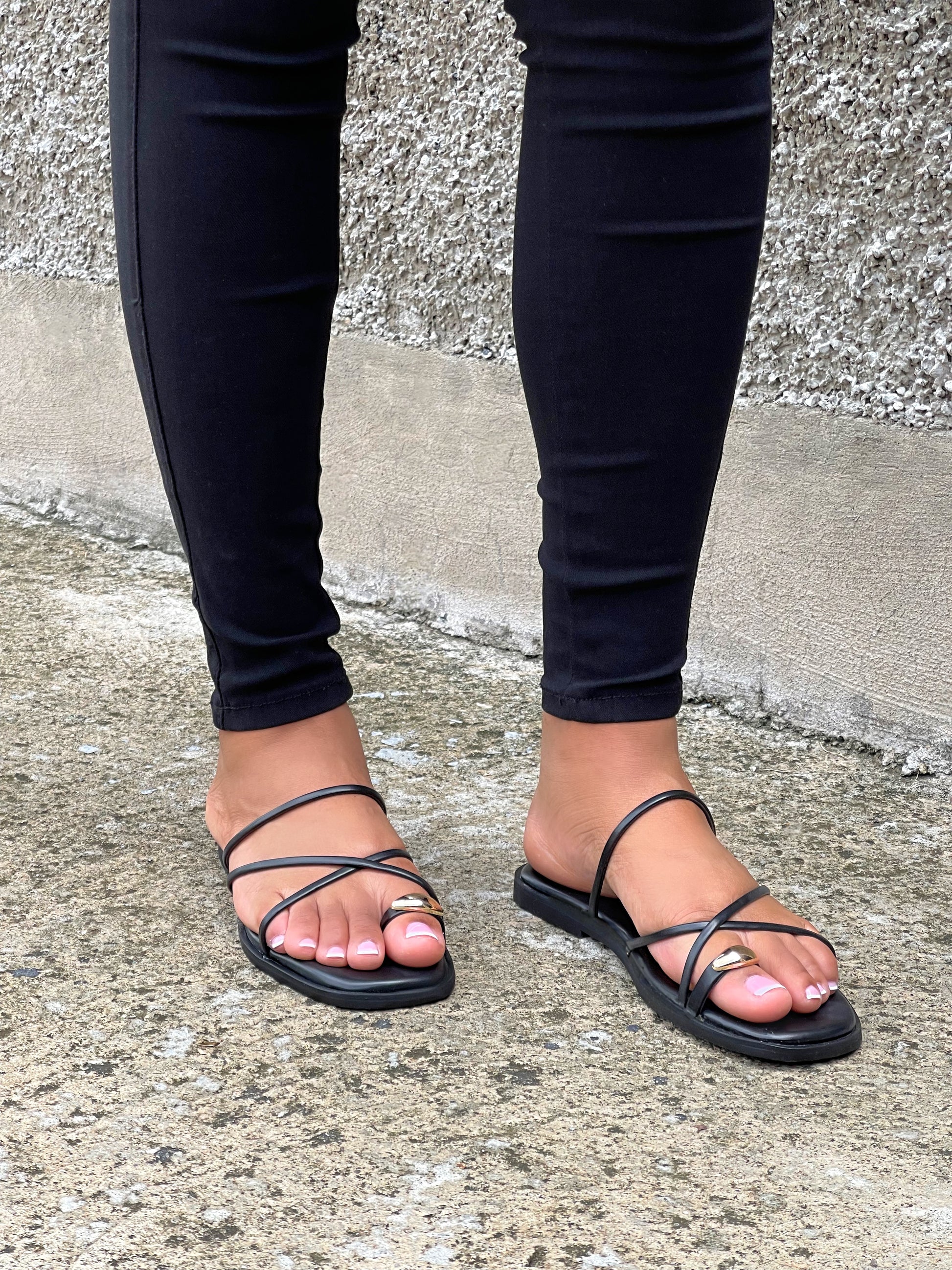 Minimal, modern, and made to turn heads, The Milan Sandals is your go-to sandal for refined simplicity. Featuring delicate black straps with a striking gold-tone toe ring accent, this flat silhouette adds a touch of edge to your summer wardrobe. The open design keeps it airy and effortless, while the barely-there straps create a clean, elevated vibe perfect for brunch dates, rooftop drinks, or day-to-night looks.