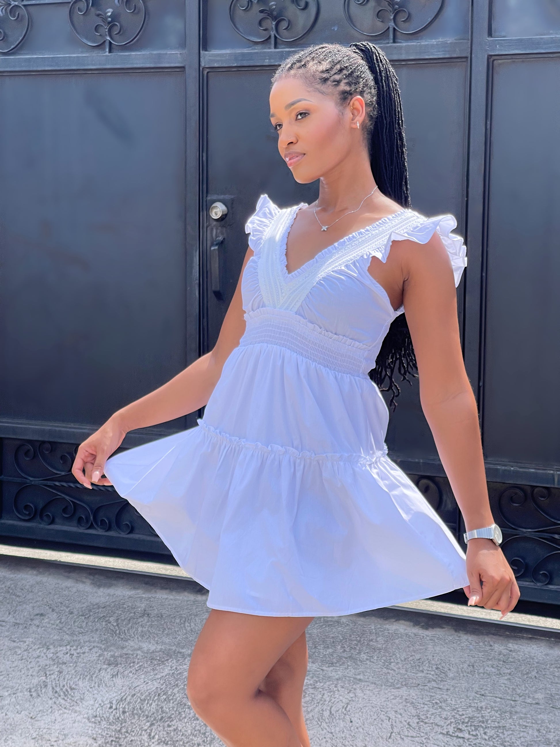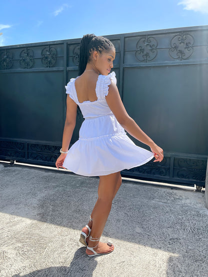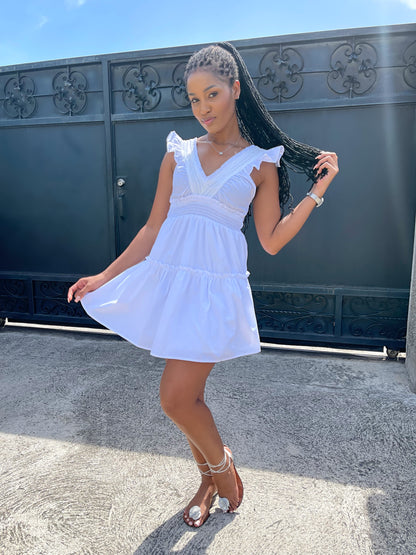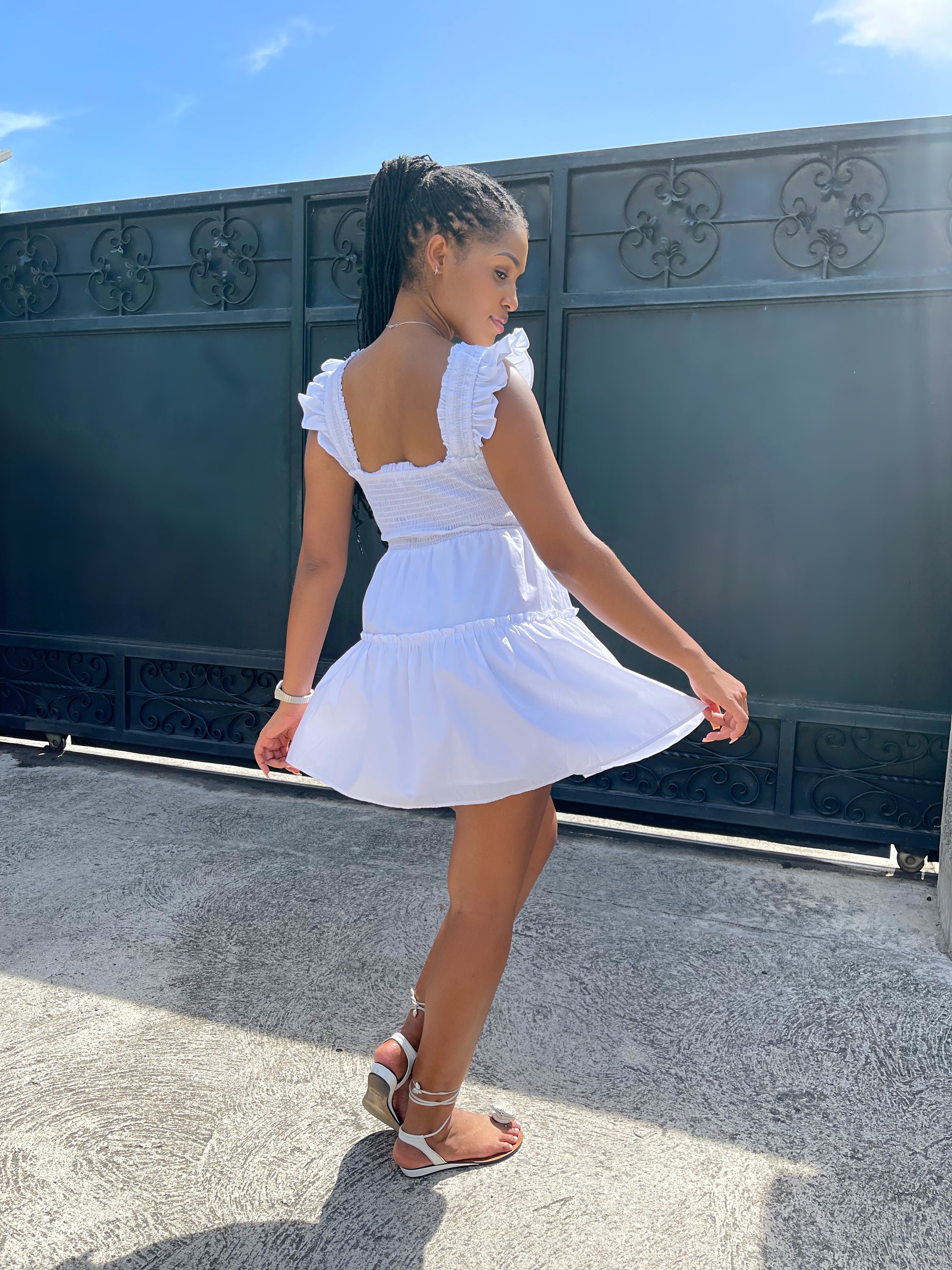 Elevate your wardrobe with the Orielle Mini Dress in crisp white. This charming dress features a flattering V-neckline and playful ruffled short sleeves that add a touch of whimsy. The smocked waist enhances your silhouette, while the tiered skirt with delicate ruffles creates a flirty, feminine look. Perfectly mini in length, it’s ideal for sunny days and casual outings where effortless style is a must. Embrace comfort and cuteness in one beautiful piece.